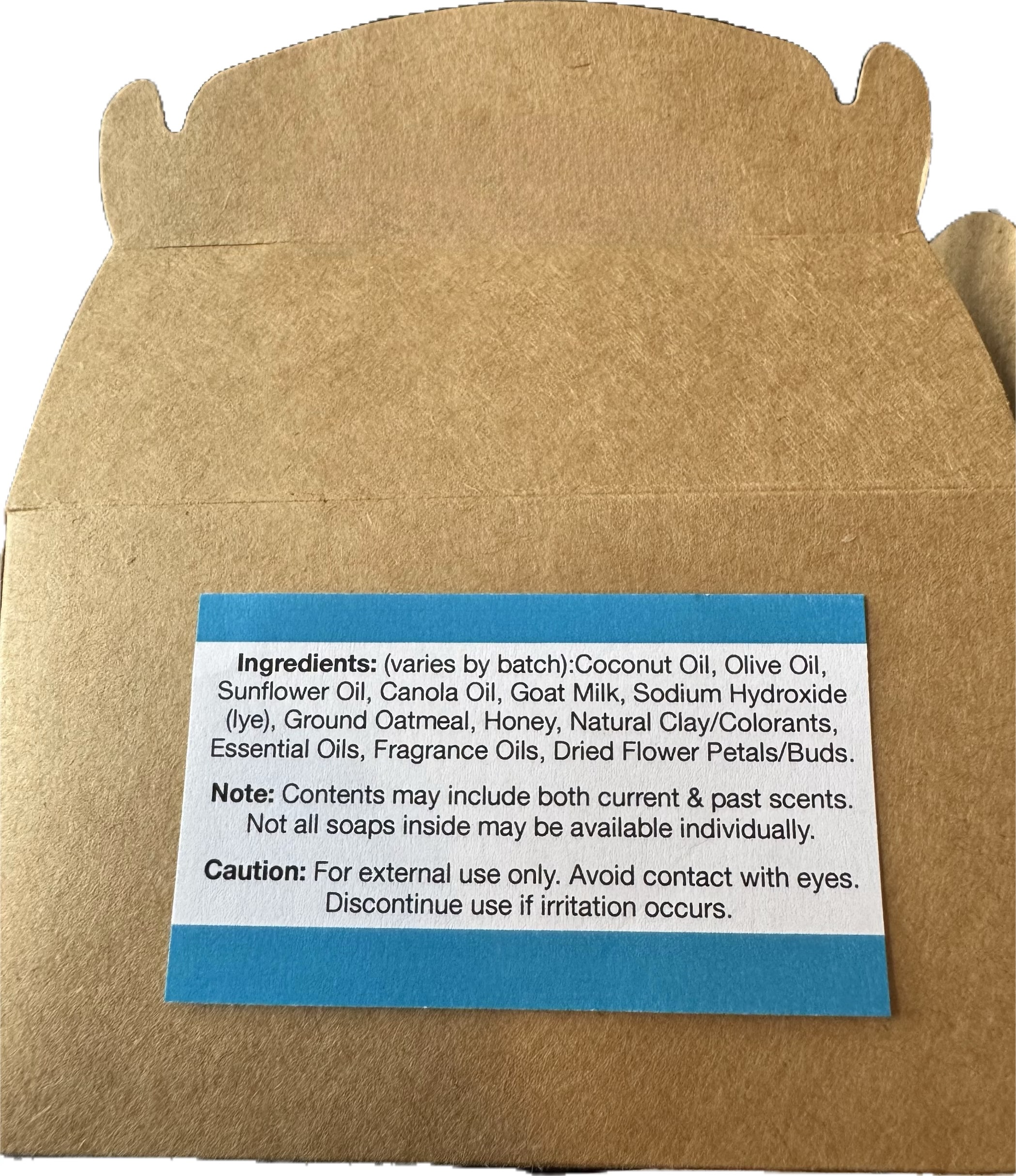 Each box contains approximately 8 oz (ยฝ lb) of soap in mixed sizes and shapes. You may receive a combination of both current scents and retired seasonal favorites, depending on whatโs freshly trimmed from our curing racks. Every piece is made in small batches with our farm-fresh goat milk, nourishing oils, and natural colorants โ always preservative-free and dye-free.